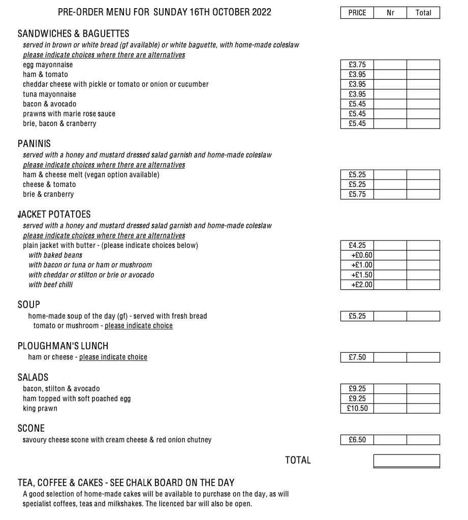 Please email Alan to prebook food. Thanks. ablake3814@aol.com Back Share this: Share on X (Opens in new window) X Share on Facebook (Opens in new window) Facebook Like Loading...